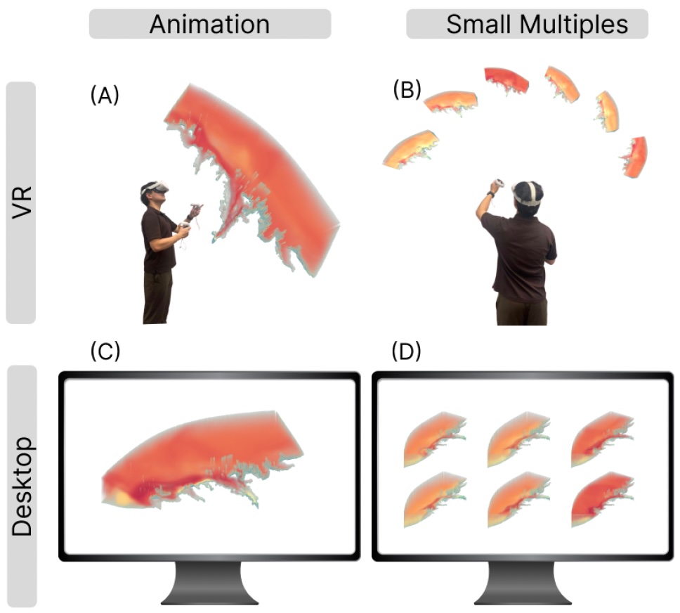 Towards Understanding Time-Varying Spatial 3D Data Analysis with Animation and Small Multiples in Virtual Reality and Desktop